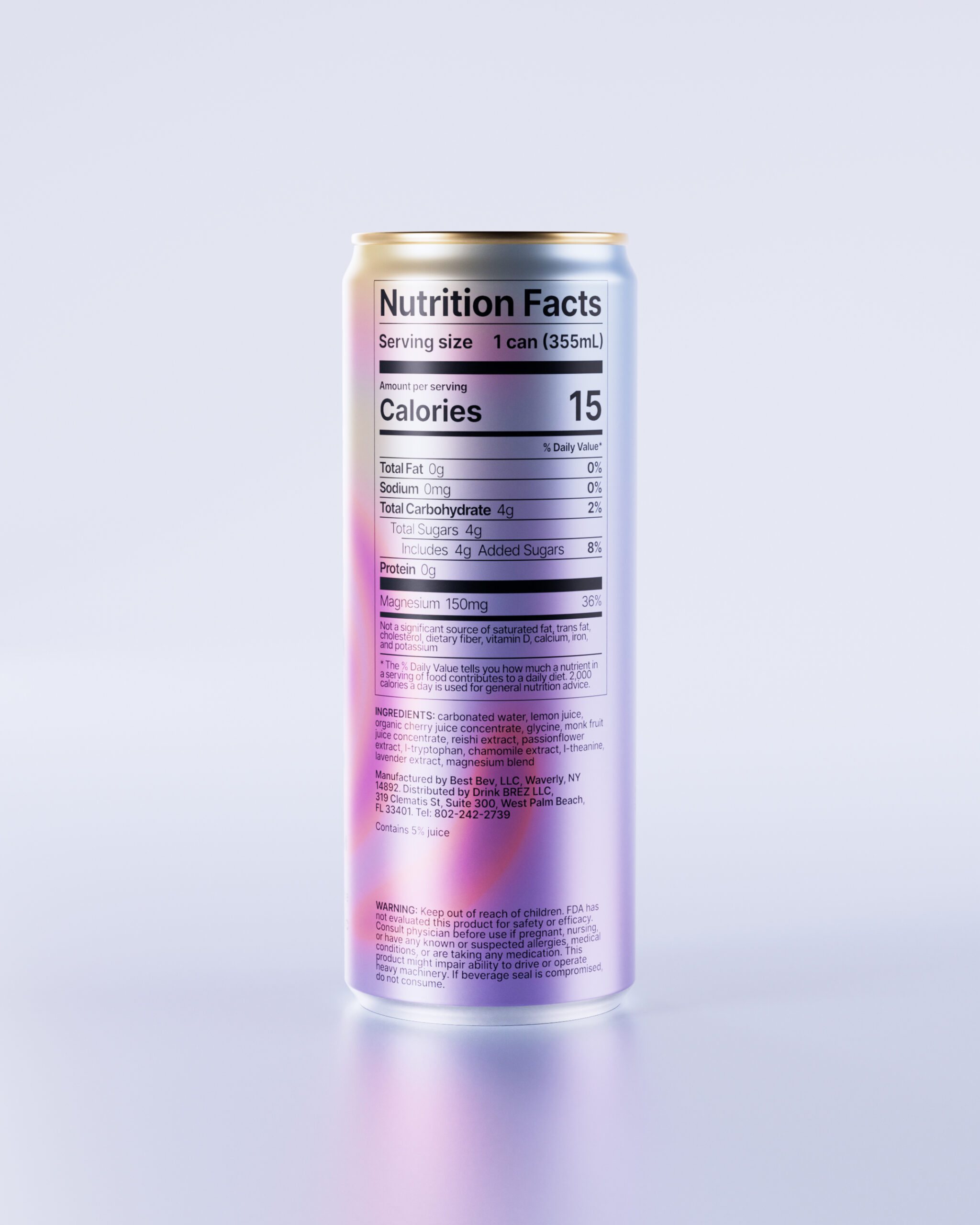 | Ingredients | Carbonated water, Organic cherry juice concentrate, Lemon juice, Monk fruit juice concentrate, Reishi extract, Passionflower extract, Chamomile extract, Lavender extract, L-tryptophan, L-theanine, Glycine, Magnesium blend |